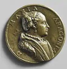 Maria d'Aragona (1503–1568; born in d'Avalos Castello in Ischia) was the daughter of Duke Ferdinando di Montalto and Catalina Cardona and the granddaughter of King Ferdinand I of Naples, also called King Ferrante.[1] As a child, Maria d’Aragona grew up in a castle with the poet Vittoria Colonna, who had married d'Avalo's nephew.[2] It was here that Maria met Sannazaro, Tansillo, and Bernardo Tasso who would entertain her in later life at her own salons in Naples, Milan, and Pavia.[3]
