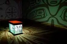 Nicolson's work Waterline, exhibited in 2018 at the Birmingham Museum of Art, gives focus to sacred and life-sustaining waterways.[20] The form of the sculpture is derived from traditional bentwood boxes. The images that are presented as the light moves up and down, mimicking the tidal flow of waters, show animals and symbols important to Nicolson's Kwakwaka’wakw heritage. The installation references ancient Kwakwaka’wakw cliff pictographs that are in danger of being lost because of industrial structures now control the rise and fall of river-water levels and indigenous sites, causing ancient Kwakwaka’wakw pictographs on cliffs and river rocks to disappear under rising water, and then reemerge.[21]