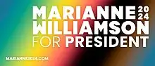 Williamson ran unsuccessfully as an independent for California's 33rd congressional district in the United States House of Representatives in 2014, finishing fourth with 13.2% of the vote.[2] She ran for the Democratic nomination for president in 2020, eventually dropping out and endorsing Bernie Sanders.[3][4] She is running in the 2024 Democratic Party presidential primaries.[5] Williamson's presidential platform calls for an end to the war on drugs, a federal minimum wage increase, reparations for racial injustice, addressing climate change, and creating a U.S. Department of Peace.
