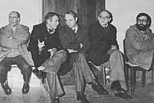 In 1973 and for reasons which are not clear Zufía did not seek prolongation of his term in the city council;[71] as a result, it expired in 1974.[72] However, the same year he stood in elections to Consejo Foral, a peculiar provincial Navarrese advisory body with rather limited powers; he was comfortably elected.[73] During final years of Francoism Zufía and his sons[74] were heavily engaged in numerous semi-clandestine activities, e.g. since 1974 in his house he hosted the editorial board of a bulletin titled Denok batean and provided residence to its chief editor.[75] In establishment circles he was viewed as a dangerous subversive; in spite of earlier arrangements he was not promoted to director of the Banco de Bilbao Pamplonese branch.[76] His relations with the bank were already loose; in the early 1970s he was on unpaid leave, which enabled him to take a job restructuring financial structures of the Pamplona diocese.[77] Eventually, in late 1975 he arranged for premature retirement from the bank and despite poor conditions offered, he did retire the following year.[78]