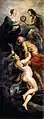 The last painting in the cycle, The Triumph of Truth, is a purely allegorical depiction of King Louis XIII and his mother, the Queen, reconciling before heaven.[108] The Queen and Louis XIII are depicted floating in heaven, connected by the symbol of concordia, which demonstrates her sons’ forgiveness and the peace that was reached between them. Below, Saturn raises Veritas to heaven which symbolizes truth being, "brought to the light", as well as the reconciliation between the Queen and her son.[109] The illustrations of Time and Truth occupy almost 3/4 of the lower canvas. The upper part of the canvas is filled with renderings of Marie and her son. In the composition, Marie is depicted as much larger than her son and occupies much more space.[110] Her larger, less obscured body is turned frontally on the picture plane, which emphasizes her importance. Her importance is further highlighted by her equal height to her son, the King.[111] Her son who is obscured in part by the Wing of Time, kneels before the queen and presents her with the token of amity, the clasped hands and flaming heart within a laurel crown.[112] Compositionally, Rubens gives the queen greater importance in this panel through the use of gestures and gazes. In the work, Truth gestures toward the Queen while Time looks toward her from below. Both figures ignore the King.[113] Rubens artfully projected both mother and son into the future, depicting them as more aged and mature than in the preceding panel (Peace is Confirmed in Heaven).[114] It is at this point that the Medici Cycle changes to the subject of the Queen Mother's reign.[82] With the death of son Louis' court favorite, Charles d'Albert de Luynes, mother and son reconcile. Marie receives ultimate vindication by being re-admitted to the Council of State in January 1622.[115] This picture represents how time thus uncovers the truth in correspondence to the relationship between Marie and her son.[108]
