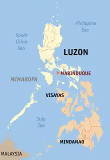 Marinduque's at-large congressional district, also known as Marinduque's lone district, is the sole congressional district of the Philippines in the province of Marinduque. Marinduque has been represented in the country's various national legislatures since 1898.[3] The first congressional delegation consisted of two members in the First Philippine Republic legislature known as the Malolos Congress. Since 1922 when it was re-established as a regular province separate from Tayabas, Marinduque has been entitled to one member in the House of Representatives of the Philippines, elected provincewide at-large, except for a brief period between 1943 and 1944 when it was again eliminated and included as part of Tayabas's at-large representation for the National Assembly of the Second Philippine Republic.[4]