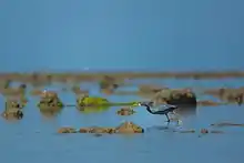 Jellyfish, Portuguese man of war and sea anemones are other coelenterates found here. Arthropods include 27 species of prawns, 30 species of crabs, lobsters, shrimps and other crustaceans. Molluscs like pearl oysters and sea slugs are present. Octopus which change colour are also found. Echinoderms like starfish, sea cucumbers and sea urchins are present. The fishes found are puffer fishes, sea horse, sting ray, mudskippers and whale sharks which are an endangered species. Endangered sea turtles such as green sea turtles, olive ridleys and leatherbacks are seen here. There are three species of sea snakes. There are dugongs and smaller cetaceans like finless porpoises, common dolphins, bottlenose dolphins and Indo-Pacific humpback dolphins.[2] Larger whales[3] such as blue whales,[4] sei whales are seen.[5] Humpback whales, and sperm whales may have been almost wiped out due to illegal whaling by the Soviet Union and Japan.[6] Whale sharks can be found in deeper areas.[7] A surprisingly large scale greater flamingo colony, reaching up to 20,000 nests is known to occur along the gulf and many other birds species found here like crab plovers, sandpipers, western reef egret, great egret, ruff, eurasian oystercatcher, greenshanks, redshanks, gulls, skimmers, ducks, pelicans, storks, Godwits, terns.[8] There are 42 islands in the Arabian Sea with coral reefs and the park is situated in one of those.[9]