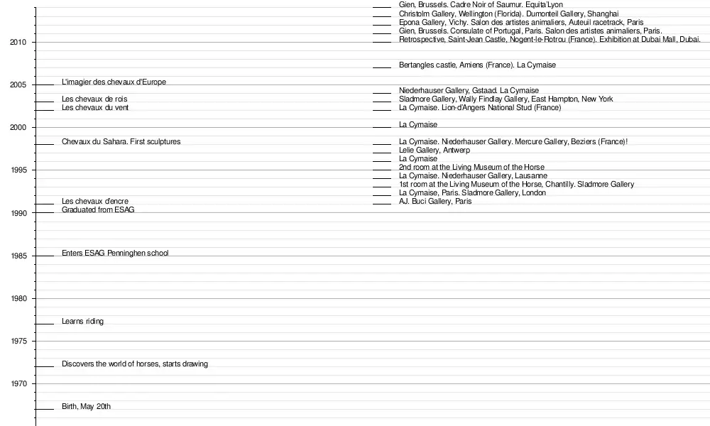 A sculptor too, she showed her first bronze casts in 1996. Over time, her work expanded as she explored different medium, creating designs for collections of Gien earthenware called " Horses of the Wind " and " Horses of the Sun " or as a regular contributor for Belin publishing. She mainly works using ink, no models, which enables her to express her unique style and artistic freedom. Her works have been exhibited all over the world, especially in Switzerland, England (London), the United States, the United Arab Emirates and China. In 2010 a major retrospective exhibition of her works was held at Saint Jean castle in Nogent-le-Rotrou, now a museum. Art reviewers have often praised the elegance of her stroke, the delicacy, the accuracy of anatomy, the movement and dream like quality expressed in her works.