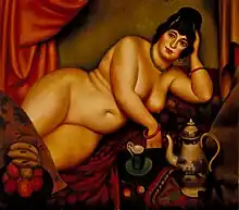 Gertler's patron was Lady Ottoline Morrell,[13] through whom he became acquainted with the Bloomsbury Group. She introduced him to Walter Sickert, the nominal leader of the Camden Town Group.[14] Gertler was soon enjoying success as a painter of society portraits, but his temperamental manner and devotion to advancing his work according to his own vision led to increasing personal frustration and the alienation of potential sitters and buyers. As a result, he struggled frequently with poverty.