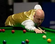 King began the 2012–13 season by failing to qualify for three of the first four ranking events.[23] The one he did reach was the Shanghai Masters, where he beat Zhao Xintong 5–3 in the wildcard round and local favourite Ding Junhui 5–4 in the first round, having trailed 0–3.[24] He lost 3–5 to Shaun Murphy in the following round.[25] King saw off Mark Williams 6–3 in the first round of the 2012 UK Championship, before surrendering a 3–0 lead against 17-year-old Luca Brecel to lose 4–6.[26] He also reached the second round of the German Masters by whitewashing Stephen Maguire 5–0, but then lost in a deciding frame to Matthew Stevens.[23] King failed to qualify for the World Open and lost in the first round of the Welsh Open and China Open.[23] He faced Mark Allen in the opening round of the World Snooker Championship and produced a big shock by fighting back from 6–8 down to produce his best snooker at the end of the match in a 10–8 win.[27] He raced into a 6–2 lead in the first session of his second round match against Ding Junhui, before falling 7–9 behind in the next session and ultimately lost 9–13.[28] King ended the season ranked world number 29.[29]