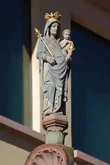Thestructure of this fountain is a three column fountain built of red sandstone. The round fountain vat, comprising two shallow steps is divided by the three pedestals of shallow relief pillars. These carry a triangular shaped circulating frames on which there is also the donor's inscription. Above the entablature is a figurative and ornate openwork crown from light sandstone. The completion of the fountain is a pillar baldachin. This was originally called the "market standard" with the arms of the sovereign, who acted as a protective and court Lord of the market. Today there is a subsequently sat Madonna. This was created in 1890 by the Mainz sculptor Valentin Barth and placed after the first dislocation of Marktbunnens.