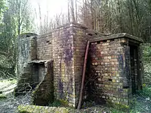 After closure, the headgears and other machinery at Marley Hill Colliery were scrapped and the buildings levelled. A hole was knocked into the wall of the square building which enclosed the top of the upcast shaft, and the rubble from the rest of the buildings tipped in to backfill it. This process having been completed, the building was demolished and a large concrete cap placed over the mouth of each shaft. There appear to be only two remaining buildings directly associated with the colliery. One of these is an airlock above a backfilled ventilation shaft from the Clockburn Drift, hidden away in Clockburn Wood near Whickham. The shaft was known as the Hollinside Shaft and actually pre-dates the drift as it was originally part of Axwell Park Colliery,[17] which was situated roughly a mile to the north-east. This colliery closed in 1954 after men from Marley Hill began working its remaining reserves beneath Hollinside and Gibside via the drift, at which point the NCB installed a fan to aid ventilation, these workings being some distance from the Shafts at Marley Hill Colliery itself. The other remaining structure is a curious rendered brick hut with double-walled construction and heavy steel doors, which stands in the middle of a field to the south of St. Cuthbert's Park. It is best to consult Google Earth to pinpoint the location. This is the colliery's former powder magazine, where explosives for use underground were stored. It was presumably constructed sometime in the first couple of years of the 20th century, as the bricks used, which bear the name "Blythe & Sons, Birtley Station" along with the letters ER (Edward VII) and the date 1901, are of the same type (stamped 1903 and 1904) used to construct Church Street, Cuthbert Street and Glamis Terrace. It has evidently been designed to direct the force of any explosion upwards, with its isolated location meaning that the resulting debris would not land on the surrounding houses or colliery buildings. It is (for unknown reasons) sometimes referred to locally as "the butterfly chambers" and fell out of use some time before the colliery closed, with one former Marley Hill miner recalling playing in it as a child. A new explosives store was built to replace it, this building being situated near the pit head baths.