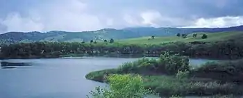 The Marsh Creek watershed drains about 100 square miles (260 km2) of the eastern slopes of Mt. Diablo and the neighboring portions of the Black Hills. Its upper tributaries are intermittent and small perennial streams which flow northwesterly until the creek turns east at Marsh Creek Springs. The creek was dammed downstream from the Springs in the 1960s, forming Marsh Creek Reservoir. The dam is south of Brentwood and north of the intersection of Marsh Creek Road and Camino Diablo Road.[4] Major tributaries are Briones, Dry, Deer and Sand Creeks. Briones Creek, which drains the undeveloped Briones Valley, flows into Marsh Creek at Marsh Creek Reservoir, which lies in Marsh Creek State Park (California). Dry, Deer, and Sand creeks all flow into Marsh Creek within the city limits of Brentwood.[5] The creek is largely channelized in the lower watershed, and includes a drop structure near the city of Brentwood that appears to be a complete passage barrier. The lower stretch of the creek includes 11 miles (18 km) from the outfall of the Marsh Creek Reservoir into the western Delta at the Big Break Regional Shoreline area of the Sacramento–San Joaquin River Delta northeast of the city of Oakley.[6]