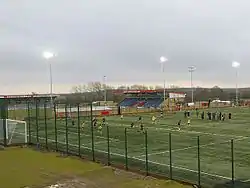 The flagship of the complex is the Leicester Road Stadium, a 4,329 capacity purpose-built football ground, comprising a gymnasium, sports injury clinic and a social club. The Stadium opened in March 2005 when Stalybridge Celtic were the first team to play Hinckley United on the ground, in front of a crowd of over 2000.[2]