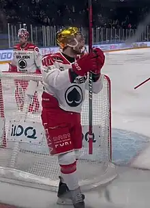 Lefebvre with Porin Ässät in 2023 wearing the top scorer's golden helmet