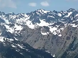 Martin Peak is a mountain summit in the Olympic Mountains and is located in Jefferson County of Washington state. It is located within Olympic National Park. At 7,638 feet (2,328 m) high, Martin Peak is the seventh-highest peak of the Olympic Mountains, and the second-highest peak in The Needles range, which is a subset of the Olympic range.[1] Its nearest higher neighbor is Mount Johnson, 0.53 mi (0.85 km) to the north-northwest.[1] Precipitation runoff from this peak drains west into headwaters of Gray Wolf River, or east into Royal Creek, both of which are part of the Dungeness River drainage basin. Martin Peak was given its name based on the first ascent in 1940 by George W. Martin (1901–1970), and Elvin Johnson.[4]