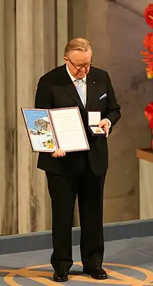 Ahtisaari was a United Nations special envoy for Kosovo, charged with organizing the Kosovo status process negotiations. These negotiations aimed to resolve a long-running dispute in Kosovo, which later declared its independence from Serbia in 2008. In October 2008, he was awarded the Nobel Peace Prize "for his important efforts, on several continents and over more than three decades, to resolve international conflicts".[1] The Nobel statement said that Ahtisaari had played a prominent role in resolving serious and long-lasting conflicts, including ones in Namibia, Aceh (Indonesia),[2] Kosovo and Serbia, and Iraq.[3]