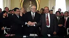 During Ahtisaari's term as president, Boris Yeltsin and Bill Clinton met in Helsinki.[32] He also negotiated alongside Viktor Chernomyrdin with Slobodan Milošević to end the fighting in the Yugoslav province of Kosovo in 1999.[33]
