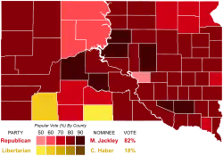 Jackley lost in the June primary to U.S. Representative Kristi Noem. Jackley only won 7 of South Dakota's 66 counties. Jackley received 45,069 (44%) votes and Noem received 57,437 (56%) votes.[44]