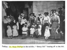 During World War I, Phillips was invited to join the Scottish Women's Hospitals personnel at Calais, where she began serving at Christmas in 1914. She ran a typhoid hospital there, briefly, then transferred with Elsie Inglis to the Scottish Women's Hospitals operation in Serbia, where she held the rank of senior physician.[6] She returned to Great Britain to recover her health in 1915, then gave lectures in Wales about her experiences to raise funds for the war work of the Scottish Women's Hospital.[7][8] Welsh audiences were especially interested in her stories of Welsh soldiers she encountered in her work.[9] She resumed her own hospital work in 1916, in Ajaccio, Corsica, where she would stay as Chief Medical Officer until mid-1917.[10] Her work at Ajaccio was with women war refugees, and in May 1917 she posed proudly for a photograph with the Serbian mothers and babies she cared for during her year there.[11][12] Phillips also wrote am article for 'Common Cause' detailing her work, and that of the hospital.[13]