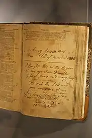 Two of Mary Jones' bibles are known, supporting the version of the story where she buys three books from Thomas Charles. One Bible is in the British and Foreign Bible Society's Archives in Cambridge University Library[6][7] and one in the National Library of Wales.[8] They are copies of the 1799 edition of the Welsh Bible, ten thousand copies of which were printed at Oxford for the Society for the Propagation of Christian Knowledge. In addition to the Old and New Testaments and the Apocrypha, the volume contains the Book of Common Prayer (in Welsh) and Edmwnd Prys's Welsh metrical Psalms.