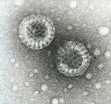 Description: Electron micrograph of two rotavirus particles that have been negatively stained with potassium phosphotungstate