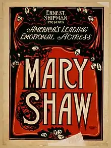 An early edition of The Theatre Magazine claimed that "to see Mary Shaw act...is inevitably to feel an interest in the woman behind the actress."[6] Shaw was onstage consistently throughout her life. She was particularly drawn to the work of popular playwrights Henrik Ibsen and George Bernard Shaw, but she did not limit herself to their work. Though she starred in shows with varying production values, Shaw was picky when it came to the moral implications of her art. She often chose her roles with a feminist mindset as most plays at the time were created by men and did not portray women correctly.[7] When offered a part in Mrs. Wiggs of the Cabbage Patch, she turned it down claiming that "it teaches contentment with and resignation to poverty."[6] Her dedication to acting was inspiring. Even when her mother suddenly passed away on the eve of an opening show, she insisted on performing. Unfortunately, the reviews for the show were less than glowing as she was appropriately distracted. Shaw was often criticized for acting in a very explicit way, namely for wearing excessive makeup as in her more risqué roles.[8] Fortunately, other shows had more success. She originated the title character of G.B. Shaw's Mrs. Warren's Profession and revived the role several times in her life, each time to complimentary reviews. Shaw's role in Mrs. Warren's Profession was very controversial for the undesirable way she acted in a specific scene in the play. It was said by various critics that her character spoke in too much of a low-class tone than what was deemed socially acceptable in performance at that time.[8]