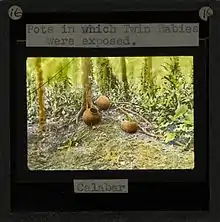 It was the belief in the area that the birth of twins was considered a particularly evil curse. Natives feared that the father of one of the infants was a 'devil child', and that the mother had been guilty of a great sin. Unable to determine which twin was fathered by the evil spirit, the natives often abandoned both babies in clay pots to die. In most of Calabar the practice had been eliminated by the Missionaries and King Eyo Honesty II. Slessor left the area of Calabar and moved further in to Okoyong. She adopted every child she found abandoned, and sent out twins' missioners to find, protect and care for them at the Mission House. Some mission compounds were alive with babies.[2][3] Slessor once saved a pair of twins, a boy and a girl, but the boy did not survive. Mary took the girl as her daughter and called her Janie. She took Janie home to Scotland with her on at least one visit.