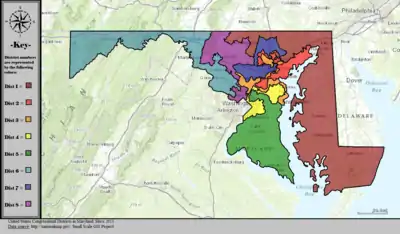 Maryland is divided into eight congressional districts, each represented by a member of the United States House of Representatives. After the 2020 census, the number of Maryland's seats remained unchanged, giving evidence of stable population growth relative to the United States at large.[1][2]