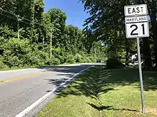 Maryland Route 21 (MD 21) is a state highway in the U.S. state of Maryland. Known as Tolchester Beach Road, the highway runs 2.42 miles (3.89 km) from MD 445 near Tolchester Beach east to MD 20 near Fairlee in western Kent County. MD 21 was constructed in the mid-1920s to provide a modern road connection to Tolchester Beach, then a major beach resort on the Chesapeake Bay. The highway's western terminus was rolled back to MD 445 in the early 1990s.