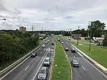 When the MD 4 freeway was completed through Melwood in 1964, MD 223 was extended north along Melwood Road, which was reconstructed as a divided highway, to its present terminus.[12][13] The highway was expanded to a divided highway on either side of MD 5 in 1989.[14] MD 223's single-point urban interchange with MD 5 was constructed in 1992.[15][16] Piscataway Road was extended south from Floral Park Road to Livingston Road as a county highway in 2007.[17] In 2011, a barrier was constructed at the western end of MD 223 at Livingston Road, making Floral Park Road a dead end; through traffic now uses the county-maintained portion of Piscataway Road to reach Livingston Road.[18][19] MD 223 was relocated at its intersection with Rosaryville Road in 2012; this work included a new bridge across the upper reaches of Pisacataway Creek.[20]