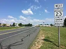 Maryland Route 23 (MD 23) is a state highway in the U.S. state of Maryland. The state highway runs 20.58 miles (33.12 km) from U.S. Route 1 (US 1) in Hickory north and west to the Pennsylvania state line near Norrisville, where the highway continues as Pennsylvania Route 24 (PA 24). MD 23 is an L-shaped highway in northwestern Harford County that consists of two major sections. Between US 1 and MD 165 in Jarrettsville, MD 23 is marked eastwest along a two-lane road with partial control of access named EastWest Highway. From MD 165 to the state line, the state highway is marked northsouth along Norrisville Road, a rural two-lane highway that passes through the villages of Madonna and Shawsville. The two sections of MD 23 are connected by a short concurrency with MD 165.