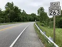 MD 263 was constructed as a 15-foot (4.6 m) wide gravel road from MD 2 east to MD 261 in Parran between 1924 and 1927.[3][4] The state highway was constructed to Plum Point in 1929 and 1930.[5][6] MD 263 was widened and paved with bituminous concrete from MD 2 to MD 261 around 1959.[7] The directional crossover intersection at the state highway's western terminus with MD 2/MD 4 was installed in 2007.[8]
