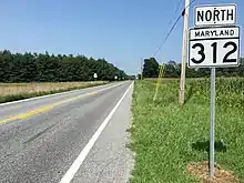 Maryland Route 312 (MD 312) is a state highway in the U.S. state of Maryland. The state highway runs 11.41 miles (18.36 km) from MD 404 near Ridgely north to MD 313 at Baltimore Corner. MD 312 traverses northwestern Caroline County, connecting Ridgely with Bridgetown. The highway's first section was paved around Ridgely in the 1910s. The highway was completed from MD 404 to Ridgely in the mid-1920s and from north of Ridgely to Baltimore Corner in the late 1920s.
