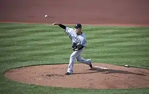 On February 14, 2017, Girardi named Tanaka the Opening Day starter for the third season in a row.[59] Tanaka was dominant in Spring Training, allowing only one earned run in 23+23 innings for a 0.38 ERA.[60] Making the Opening Day start against the Tampa Bay Rays on April 2, Tanaka lasted only 2+23 innings, allowing a career-high seven earned runs as the Yankees lost by a score of 7–3.[61] Tanaka's season started slowly until pitching a complete-game shutout against the Red Sox on April 27, the second of his career.[62] Tanaka's shutout was notable in that he only threw 97 pitches, pitching what is colloquially referred to as a "Maddux" (a complete-game shutout with fewer than 100 pitches), the first by any pitcher in the 2017 season.[63] Tanaka allowed more than three earned runs only once in the six starts after his Opening Day debacle, lowering his ERA to 4.36 by May 8.[64]
