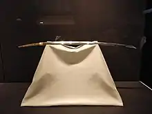 A peculiar work of Masamune, once in the possession of the Tokugawa Shogunate through the Kii Domain and gifted to the main Tokugawa family line in Edo in its prime.[24] Upon the end of the Tokugawa Era marked by the Bakumatsu, the Musashi Masamune was presented as a gift by Tokugawa Iesato in honor of Yamaoka Tesshū's efforts to facilitate peaceful negotiation with Katsu Kaishū to Saigō Takamori, sparing Edo from war and needless destruction; however, Yamaoka was humbled upon being given such a masterpiece, and had passed it down to statesman Iwakura Tomomi. Soon after seeing it passed from hand to hand throughout the 20th Century, the Musashi Masamune finally made its way to the Nihon Bijutsu Token Hozon Kyokai in the year 2000 by Motoo Otsuyasu. The Musashi Masamune is a tachi, measuring 74 cm (2 korai-shaku, 1 sun, 4.2 bun) and noted to have nearly all of the characteristics of Masamune's signature features; though it is debated that its o-kissaki is not that of his style, it is compared to blades made in his later career, which shows the transition of the Kamakura styles into the Nanbokucho era. It is rumored that, while the blade is named after Musashi Province, where Edo and current day Tokyo stands, its origin stems from being once in the possession of Miyamoto Musashi, who is considered Japan's most famous swordsman. The sword is classified as a meibutsu.
