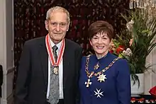 Mason (left), after his investiture as a Member of the Order of New Zealand, by the governor-general, Dame Patsy Reddy, at Government House, Wellington, on 3 May 2021