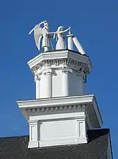 Unrelated to the construction and predating it, Albertson also hand-carved the unique sculpture of Time and the Maiden from a single redwood trunk, the finished work measuring over ten feet in height. This took place in a makeshift shelter on the beach at the mouth of Big River he was then living in, with only oil lamps for illumination.[5] Though made only as a personal exercise of craftsmanship, when the hall neared completion an informal agreement among the members was reached that it should be featured on the building and eventually was mounted atop a cupola added specifically for its display. Also known as Father Time and the Weeping Virgin it has become a local landmark, the scene depicted consisting of an hourglass at the foot of a broken column with an open book upon the part still standing, a weeping maiden reading from the book holding an urn in her left hand and a sprig of acacia in her right, and an angel with a scythe standing behind her, braiding her tresses.
