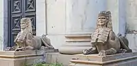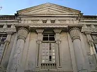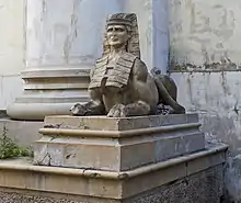 The façade is divided into three sections, the central has two huge columns with a plain shaft and palm-leaf capitals, supporting a bulky triangular pediment. In this eye there is a radiant ray, representing the Supreme Being, Great Architect of the Universe according to Masonic symbolism. Flanking each column are two sphinxes (four in total) lying on their stomachs and covered with a nemes. They were carved by the sculptor Compañ Zamorano Guzman (1878–1944). The main door is wood and carved with geometric patterns. The lintel is decorated with palm leaves and a sun with wings of an eagle, symbol of the deity Horus. The building stands on an stereobate.