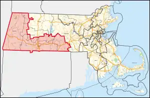 The shape of the district underwent some changes effective from the elections of 2012, after Massachusetts congressional redistricting to reflect the 2010 census.[3] The old 1st and 2nd districts were essentially merged, placing most of western Massachusetts in a single district. The entire Springfield area is included in the new 1st district, and the Worcester County areas of the old 1st district were split between the new 2nd and 3rd districts.