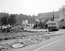As many people slept unaware, the ensuing flash floods and mudslides killed 153 people, 22 in Massies Mill alone.[5] Across Nelson County, 133 bridges were washed out, while some entire communities were under water.[6] The major flooding that occurred downstream cut off all communications between Richmond and the Shenandoah Valley. Waynesboro on the South River saw eight feet of water downtown, and Buena Vista had more than five feet. Total damage in the state amounted to $140.8 million (1969 USD, $747 million 2005 USD).[7][8][9]
