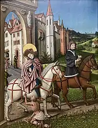 In this painting Saint Martin is seen riding on a horse and accompanied by a man riding on a horse in front of him.[6] As Martin is dividing his cape at the exit of a town, his company doesn't take notice of it.[6] In front of Saint Martin is kneeling a beggar.[6] Inside the town the houses are decorated with ornaments and there is seen a child riding on a hobby horse seemingly to imitate Saint Martin.[6] The painting is on panel and has the dimensions of 144 × 111,5 cm.[3]