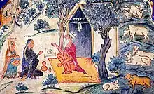 ![]() Mural depicting Mata Ganga, wife of Guru Arjan, seeking blessings from Baba Buddha at a Birh (literally a reserved forest used for cattle grazing) from Takht Hazur Sahib, Nanded, circa 19th century | |
