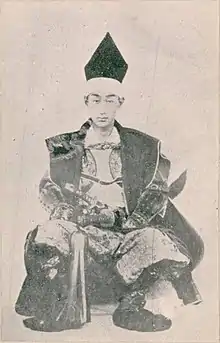 Matsudaira Katamori (松平 容保, February 15, 1836 – December 5, 1893) was a samurai who lived in Bakumatsu period and the early to mid Meiji period Japan. He was the 9th daimyō of the Aizu Domain and the Kyoto Shugoshoku (Military Commissioner of Kyoto). He initiated and established the Shinsengumi in 1863 (initially named Mibu Roshigumi).[1] During the Boshin War, he led Aizu Domain against the incipient Meiji government, but was severely defeated at the Battle of Aizu. Katamori's life was spared, and he later became the head kannushi of the Nikkō Tōshō-gū shrine. He, along with his three brothers Matsudaira Sadaaki, Tokugawa Yoshikatsu, and Tokugawa Mochiharu, had highly influential roles during the Meiji restoration and were called the "four Takasu brothers" (Takasu yon-kyōdai 高須四兄弟).
