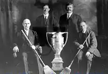 McCauley was an active member of the Edmonton community. He served as a director of the Edmonton Agricultural Association for 16 years.[23] The association brought the Edmonton Exhibition to Edmonton, one of the prominent fairs of the west at the time.[17] As telephone service was brought to Edmonton, McCauley was one of the first to receive one installed. His telephone number was #1.[17] When John Hamilton-Gordon, 1st Marquess of Aberdeen and Temair would visit Edmonton for business, McCauley and his wife would usually be the ones to entertain him.[24] Also an avid curler, McCauley was a founder of the Royal Curling Club in Edmonton and led his curling team where he served as a skip.[9] He also enjoyed other sports, including horse carriage racing.[26]