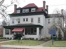 The Matthew S. Quay House is south of Beaver's downtown, at the northwest corner of College Avenue and 2nd Street. It is a 2+1⁄2-story masonry structure, built of painted brick and covered by a hip roof. A single-story porch extends across the front facade, supported by brick columns. Both the porch and main roof have eaves with carved wooden brackets. The roof on each side is pierced by hip-roofed dormers. There is a small ell projecting to the north (right), and a longer one to the rear, the latter a probable alteration by Matthew Stanley Quay.[3]