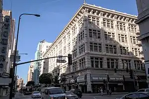 By the start of the twentieth century, A. Hamburger & Sons had even outgrown their Spring Street location, which had 520 employees working on five floors.[3] The Hamburger family decided to build a much larger store at the southeast corner of Broadway and Eighth, a location that was outside of then current retail district. Construction started in 1905 with a grand opening held in 1908.[4][5][6][7][8][9][10][11][12][13][14][15][16] This location, which was also known as The Great White Store, was the largest department store building west of Chicago at that time and would eventually become the flagship location for the May Company California. At the time that the Great White Store was opened, the store could boast of having one of the first escalators on the West Coast, several restaurants, a drug store with an 80-foot-long soda fountain,[17] grocery store, bakery, fruit store, meat market, U.S. post office, telegraph office, barber shop, a dentist, a chiropractor, a physician's office with a fully equipped operating room, a 1,000-seat auditorium,[17] an electricity and steam power plant in the basement that was large enough to support a city of 50,000 inhabitants, a private volunteer 120 men fire brigade,[18][19] 13 acres (5.3 ha) of retail space, and 1200 employees.[7][20][21][22][23][24] The Los Angeles Public Library was also located on the third floor from 1908 until it was forced to move to a larger location when it outgrew the Hamburger space by 1913.[25][26][27] For a short time, Woodbury Business College briefly was also located on the fifth floor.[28]