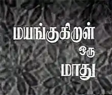 Mayangukiral Oru Maadhu (pronounced [majaŋɡukiraːɭ oɾu maːðuː] transl.A woman falls in love) is a 1975 Indian Tamil-language film directed by S. P. Muthuraman and produced by S. Baskar.[1] The film stars Muthuraman and Sujatha, with Thengai Srinivasan, Vijayakumar and Fatafat Jayalaxmi in supporting roles. It revolves around a woman who must try to keep a one-night stand that she had in college a secret from her husband, and thwart a persistent blackmailer intent on collecting money from her to keep quiet about it.