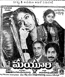 Mayuri (transl.Peacock) is a 1985 Indian Telugu-language biographical dance film directed by Singeetam Srinivasa Rao and produced by Ramoji Rao. Based on the life of Sudha Chandran, the film stars her in the title role while P. L. Narayana, Nirmalamma, Y. Vijaya, Potti Prasad, K. K. Sharma, S. R. Raju and Suthi Veerabhadra Rao played supporting roles.[1][2]