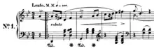 The second mazurka of the set is in C major with a tempo marking of Allegro non troppo, opening with a quiet alternation of C and G major sotto voce chords.[2] The trio is in D-flat major. The trio is closed by using repeated notes, generally open fifths.[3] The piece is also notable for its vague yet distinctly diatonic harmony, as the opening 56 bars of the piece do not feature a single accidental.[4]