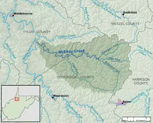 McElroy Creek is a tributary of Middle Island Creek, 22.1 miles (35.6 km) long,[5] in northern West Virginia in the United States. Via Middle Island Creek and the Ohio River, it is part of the watershed of the Mississippi River, draining an area of 106.2 square miles (275 km2)[6] in a rural region on the unglaciated portion of the Allegheny Plateau.
