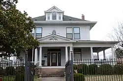 The McKennon House is a historic house at 115 Grandview in Clarksville, Arkansas. It is a two-story wood frame American Foursquare house, with weatherboard siding and a hip roof flared at the edges. The front face of the roof is pierced by a gabled dormer housing a small Palladian window, its elements separated by narrow pilasters. A single-story porch wraps around three sides, supported by Tuscan columns, with a gabled projection at the main entrance. The house was designed by noted Arkansas architect Charles L. Thompson, and was built about 1907.[2]