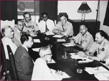 Left to right: Cabinet ministers Hafizur Rahman, Zulfikar Ali Bhutto, F.M Khan, Abul Kashem Khan, K.M Sheikh, Muhammad Ibrahim, W.A.K. Burki, & Mohammad Azam Khan with President Ayub Khan, November 1958