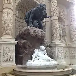 Since the fountain no longer stood against a wall, the Fontaine de Léda, displaced from another neighborhood, was placed directly behind it. (See the Fountain of Leda, below.) He replaced the two original statues of nymphs at the top of the statue with two new statues, representing the Rivers Rhone and Seine. He restored the coat of arms of the Medici family over the fountain, which had been defaced during the Revolution. He inserted two statues into the niches, one representing a faun and the other a huntress, above which are two masks, one representing comedy and the other tragedy. He removed the simple basin and water spout which had been in the niche and replaced them with a long tree-shaded basin. Finally, he removed the statue of Venus and replaced her with a group of statues by Auguste Ottin, representing the giant Polyphemus, in bronze, discovering the lovers Acis and Galatea, in white marble. The fountain was completely cleaned during the summer of 2021, and that is the fountain as it appears today.[5]